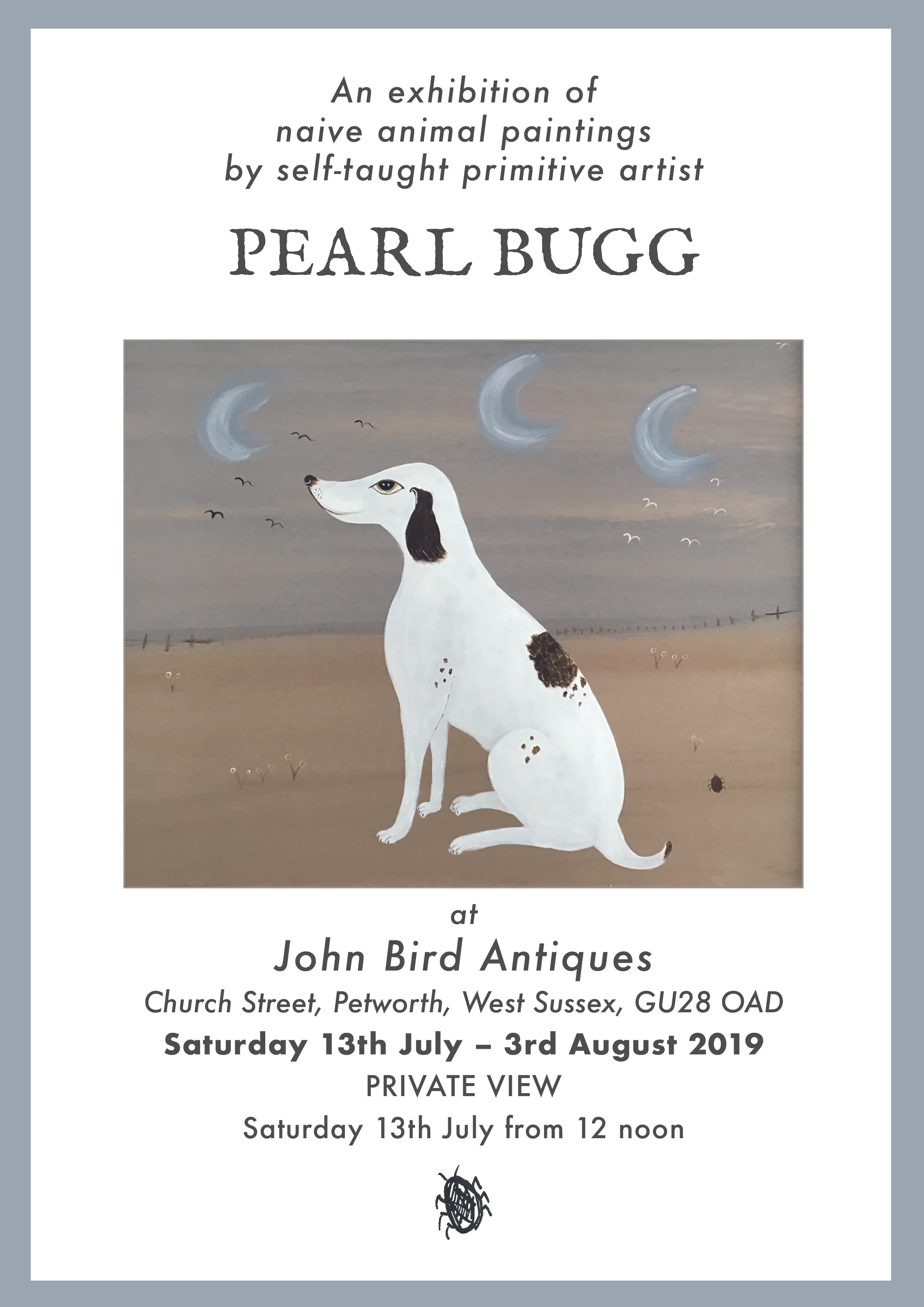 “I have great pleasure in introducing Pearl’s charming work to visitors in my Church Street shop this summer. Pearl’s paintings are rooted in the folk art tradition but have a broad appeal – delighting naive art enthusiasts and animal lovers alike and adding great warmth and character to the country house interior.” – John Bird